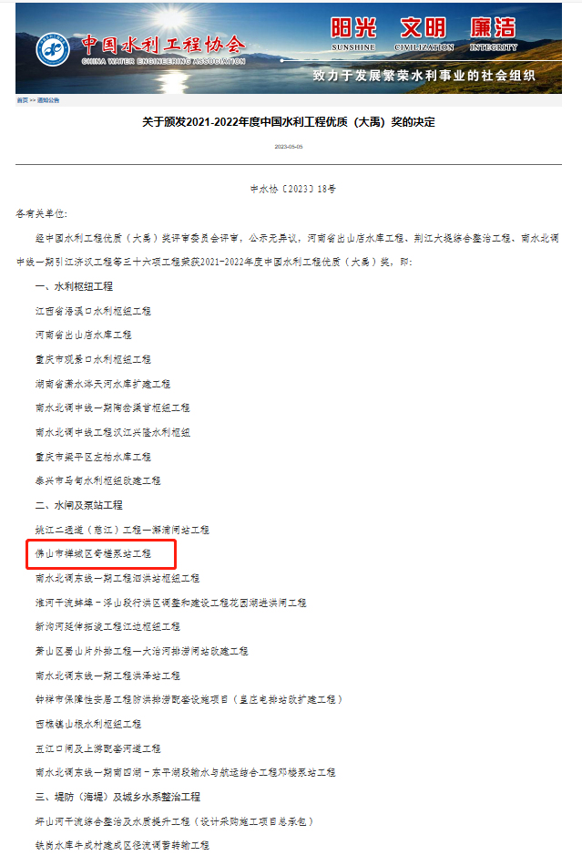 5月5日,经中国水利工程优质(大禹)奖评审委员会评审,公示无异议,禅城区住房城乡建设和水利局奇槎泵站工程荣获2021-2022年度中国水利工程优质(大禹)奖。