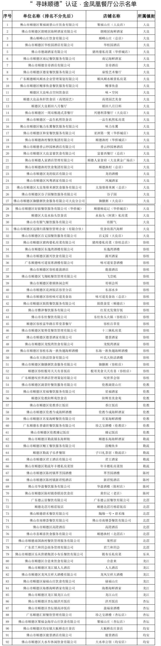 据介绍,“寻味顺德”认证(金凤凰餐厅)的认证工作,是面向区内注册登记、依法纳税、证照齐全的餐饮企业,围绕其经营环境、服务水平、菜品特色、管理能力、企业文化等内容进行综合评定。经过前期资料审核、专家现场评定、网络投票、征求职能部门意见、名单公示等名单,首批“寻味顺德认证·金凤凰餐厅”于活动上正式发布,佛山市顺德区聚福湖景山庄饮食有限公司、佛山市顺德区朗晴居海鲜酒家有限公司、佛山顺峰山庄饮食有限公司等92家餐饮名店成为“金凤凰餐厅”。在仪式现场,顺德十镇街企业代表获授予牌匾。