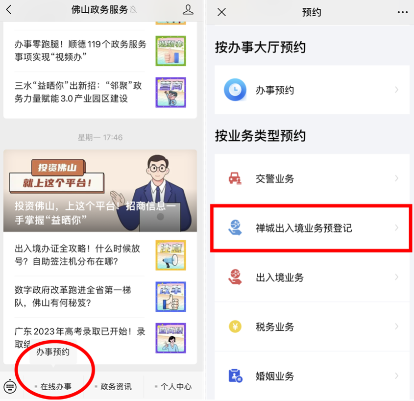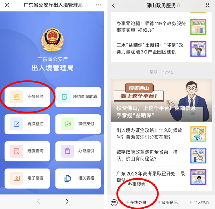 为了确保服务质量,前往办理业务的群众需提前预约。出入境业务预约方式为:“广东出入境”微信公众号,身份证业务预约方式为:“佛山政务服务”微信公众号。