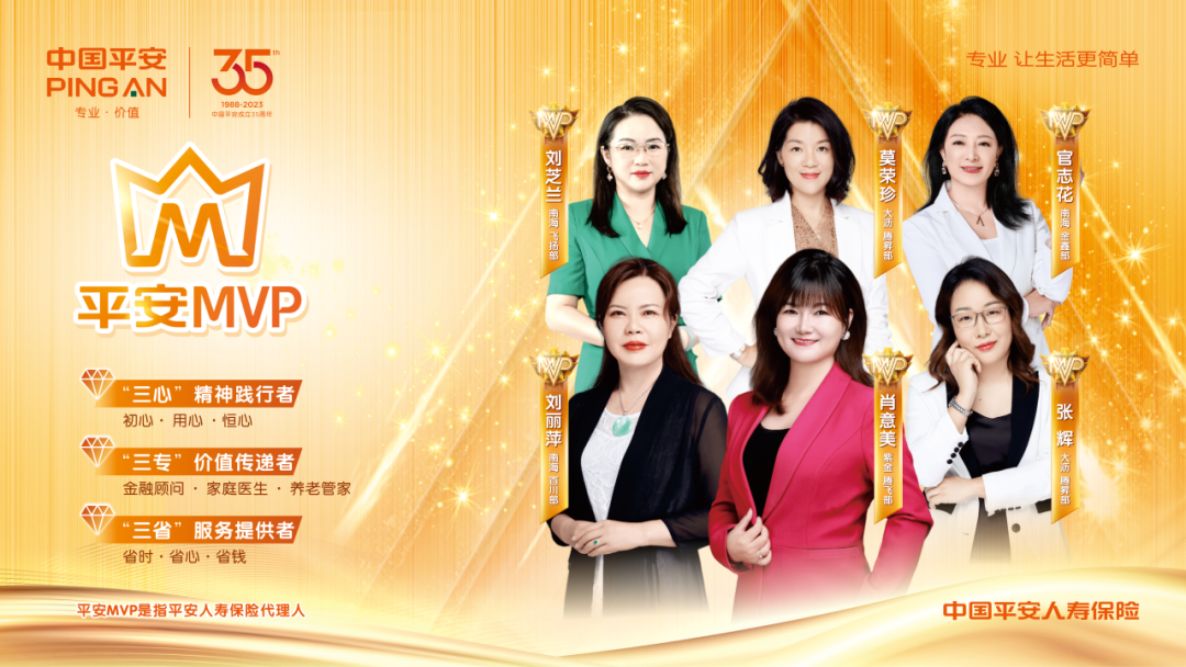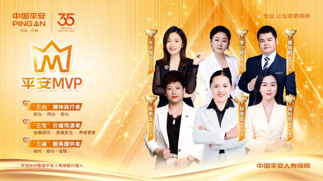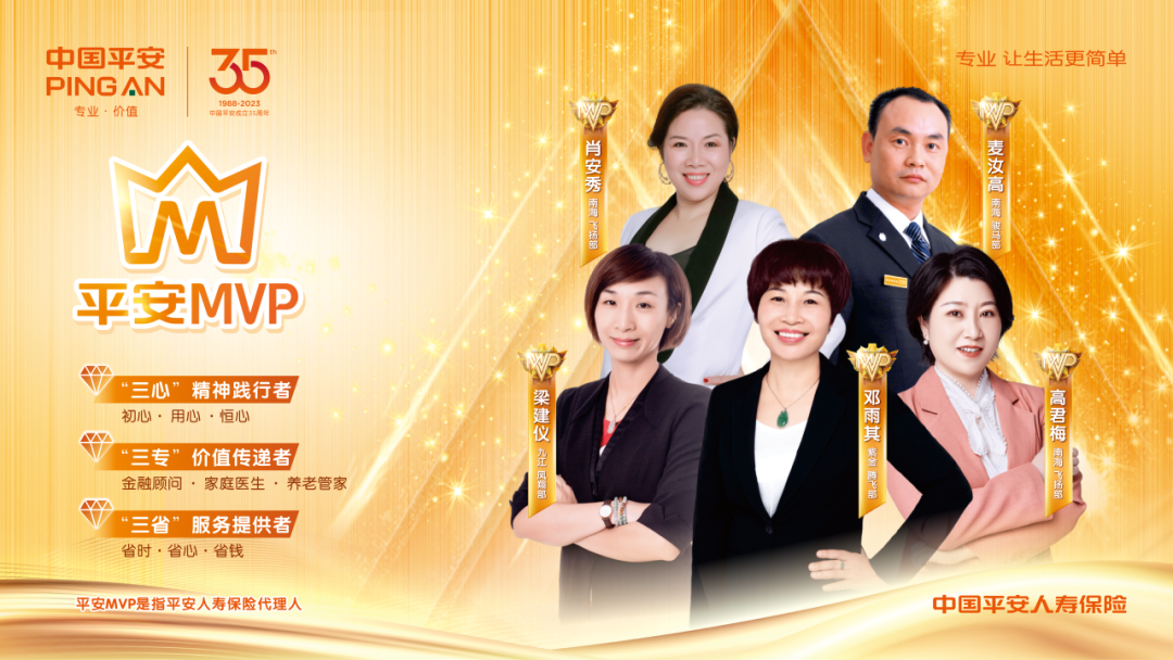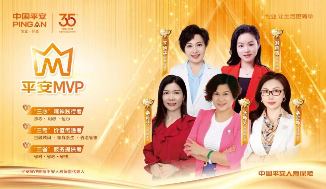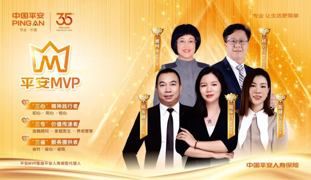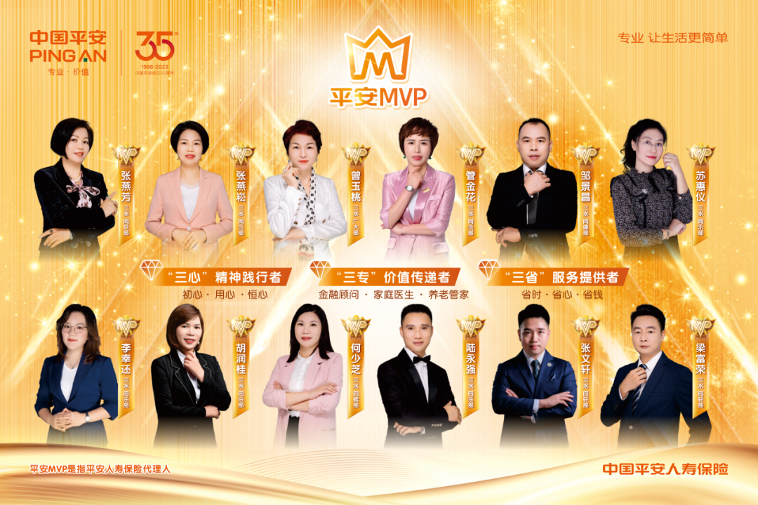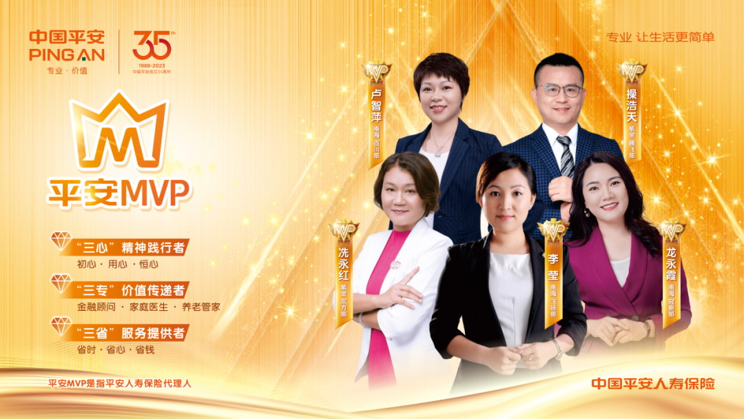平安MVP——Most Valuable Professional,即最具价值保险代理人。多年来,他们不忘初心,坚守信仰,以用心和恒心将爱与责任身体力行,致力成为“最专业的金融顾问、最专业的家庭医生、最专业的养老管家”的价值传递者,让客户“省心、省时、又省钱”。他们精进修行,志存高远,向上向善,积极服务大众,服务社会,用“专业,让每个家庭拥有平安”。