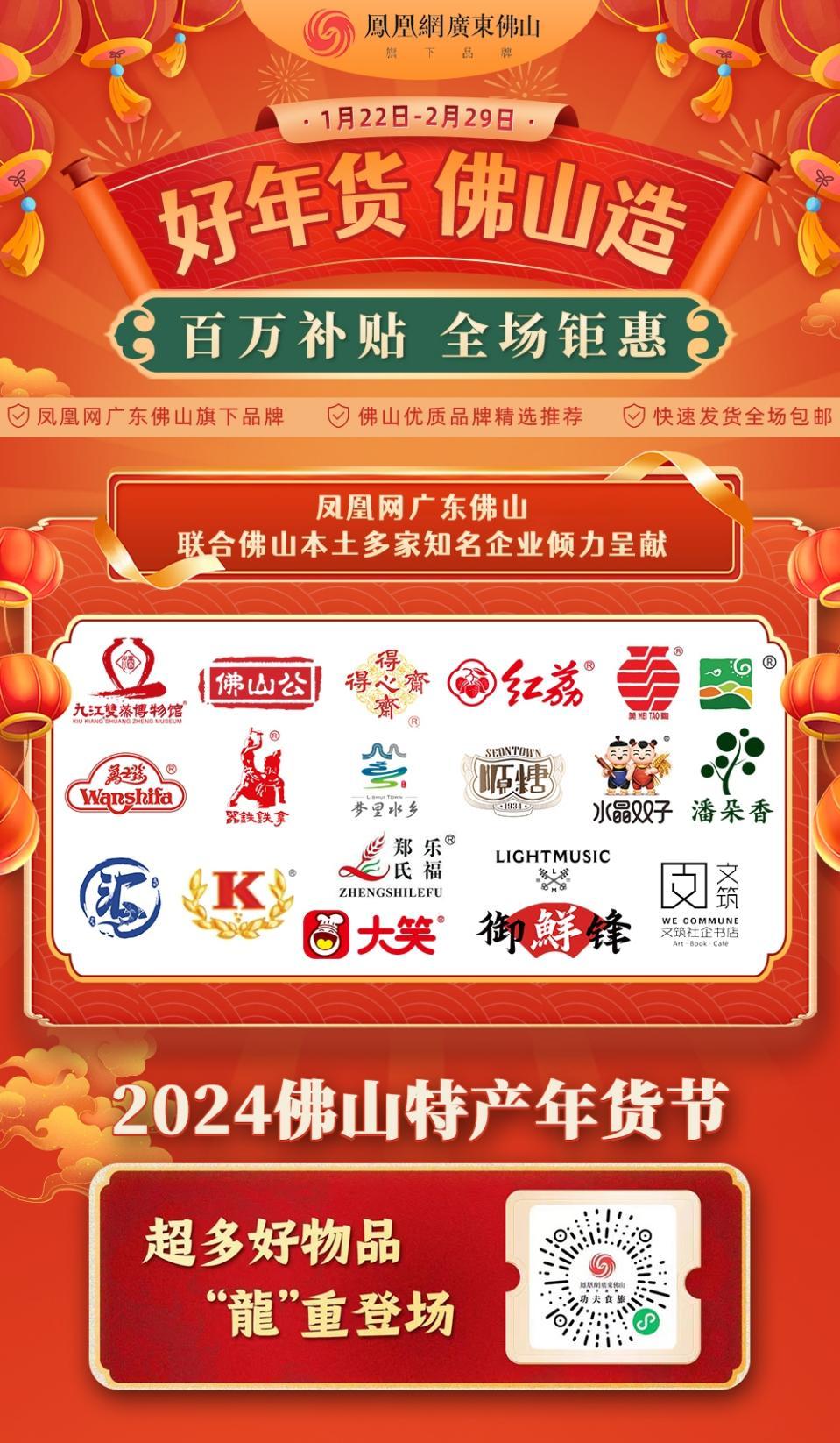 1月22日,凤凰2024佛山特产年货节正式开启,即日起至2月29日,平台百万补贴,超多佛山好物,欢迎选购。