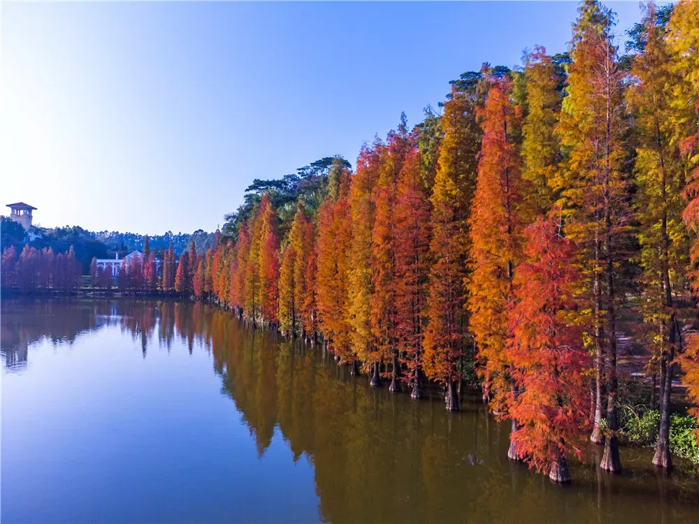 三水森林公园南湖边种植了一批被称为“活化石植物”的杉树,每年年末便开始“变装”,由翠绿逐渐变红,染红一整个湖面。杉树在湖边亭亭玉立、优雅多姿,湖水也因其平添几分旖旎风情。水杉,从恐龙时代走来,历经万年,如今在瑟瑟寒风中,依旧挺立。
