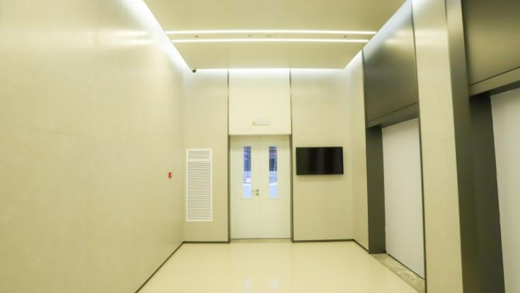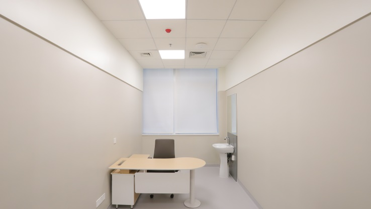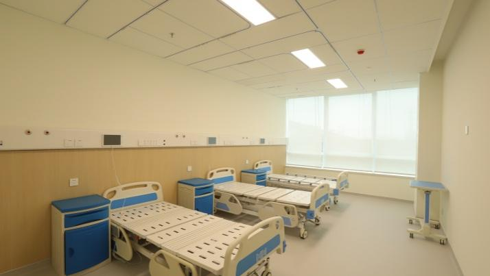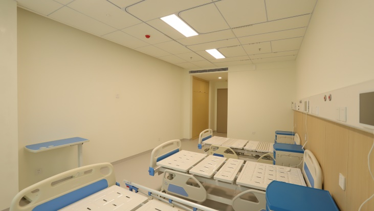 天花采用装配化集成吊顶蜂窝铝板吸声吊顶、高晶板吊顶、玻钎吸声板吊顶一体化装配化系统;改一体化安装系统材料,有着良好的防潮防水,防变形,耐擦洗的优点。针对空气层可以有效地吸收声音,从而具有良好的隔音效果。过程实现吊顶内部照明、弱点、空调、医疗设备、机电安装等集成线路管理,实现医疗空间吸声降噪营造静谧医疗空间的环境要求。