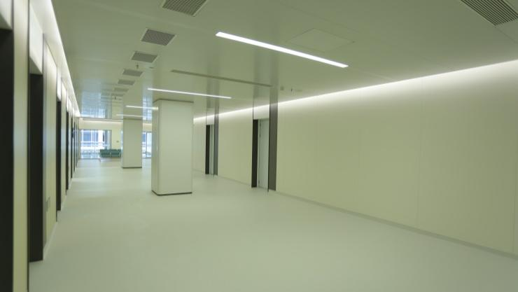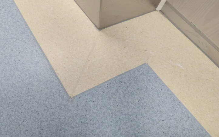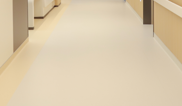 地面采用PVC医疗地胶,在大面积医疗空间采用自有技术的复式铺设法,无传统胶铺工艺。