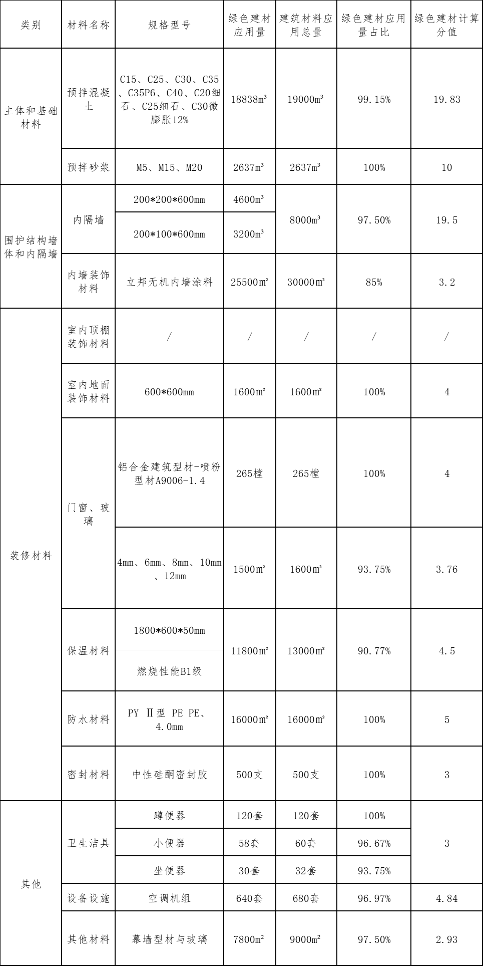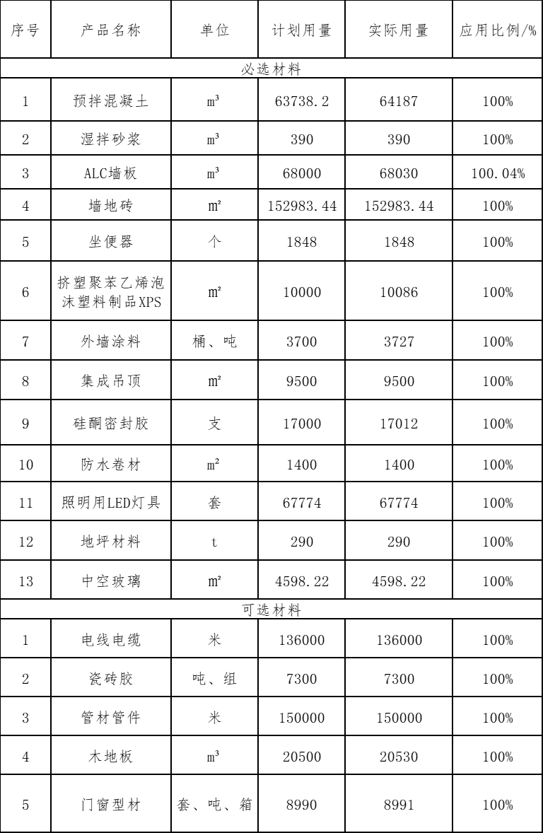 上述的必选材料和可选材料在应用比例中均全部达到100%,满足绿色建材应用占比100%的原则要求。