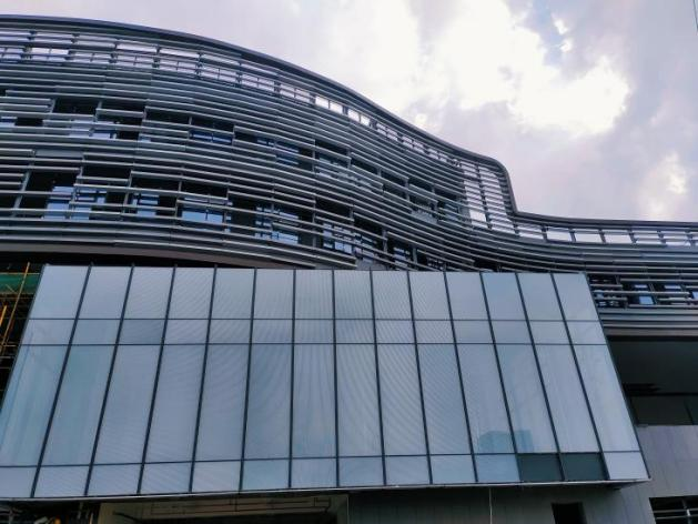 本工程幕墙外立面大部分区域采用中空钢化玻璃,是一种美观新颖节能的建筑墙体装饰,不仅具有隔音隔热防潮抗风压的优点,还可以做到冬暖夏凉、改善生活环境,使用安全承载能力增大,为保障建筑安全性作保障。