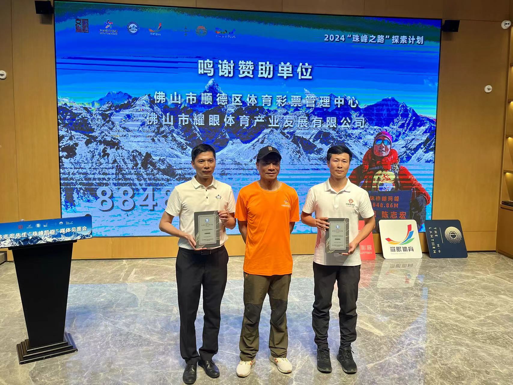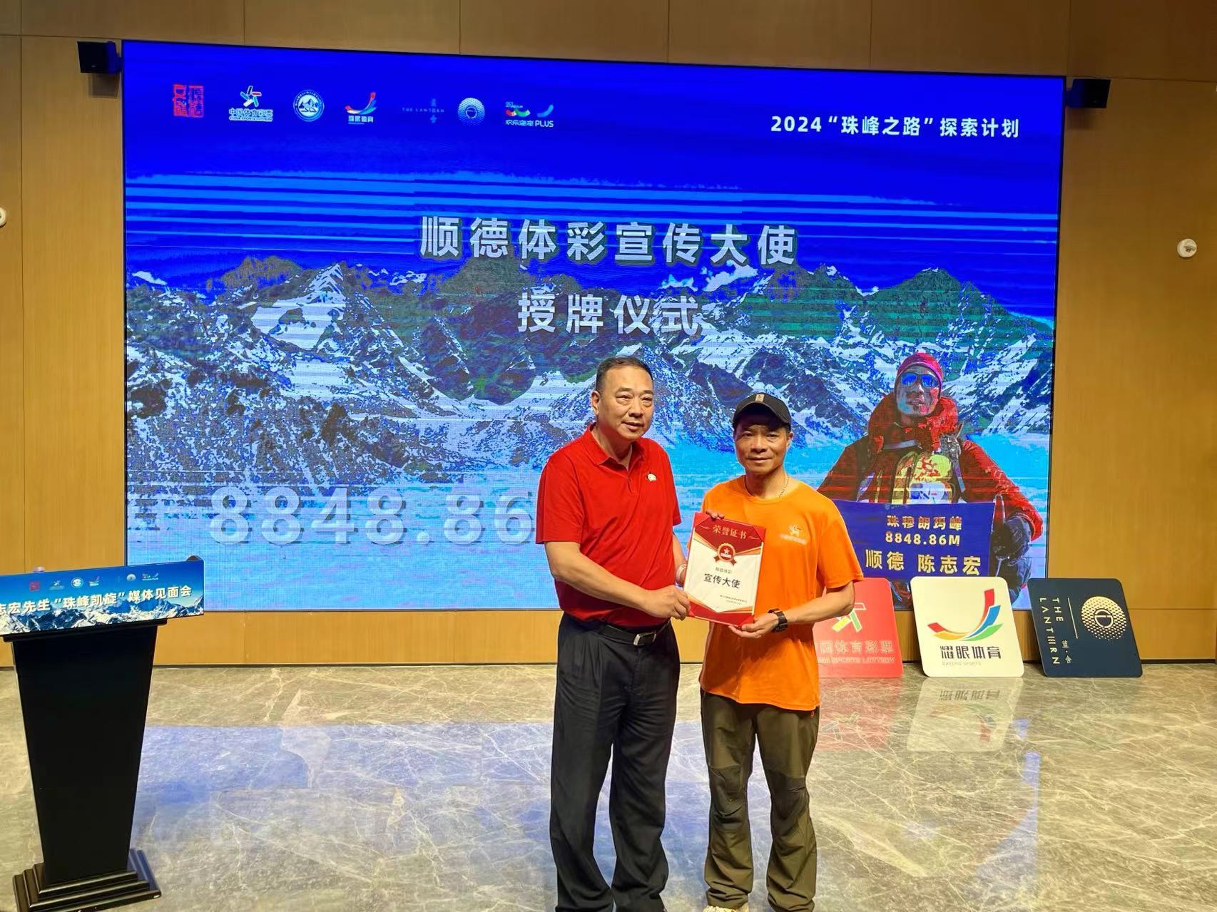 2024年是中国体育彩票全国统一发行30周年,陈志宏此次的登顶活动,得到了中国体育彩票的大力支持,现场,陈志宏被授予了“顺德体育形象大使”“顺德体彩宣传大使”称号。