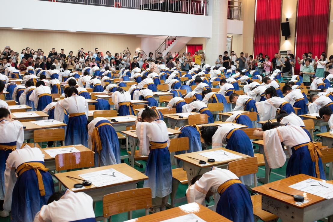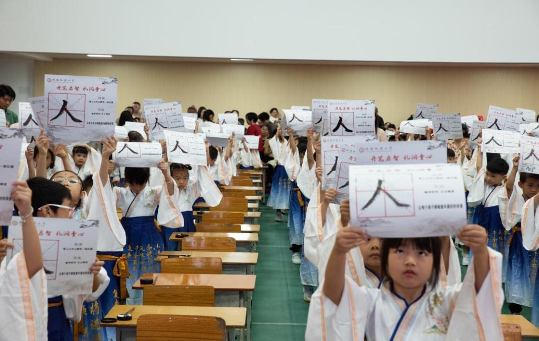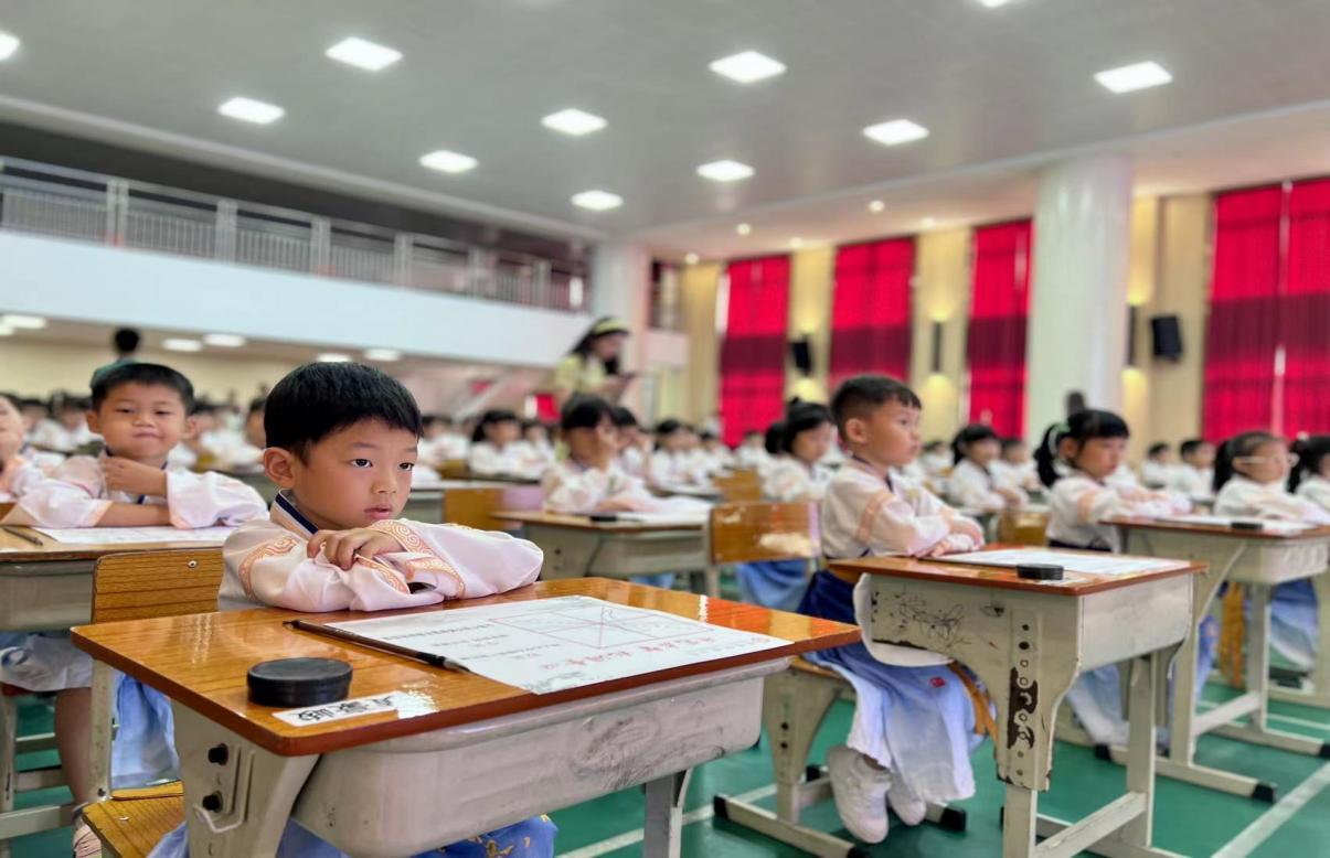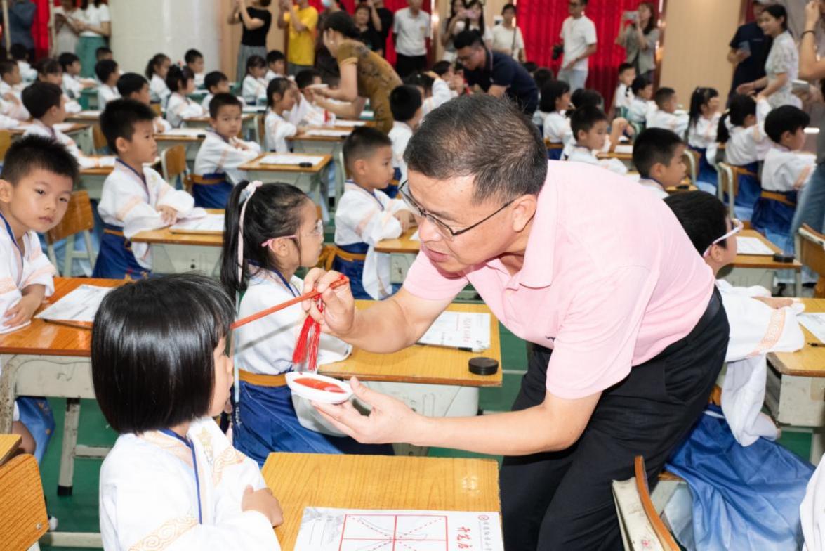 在击鼓明智环节,容桂红旗小学校长李丽击鼓三次,每一次击鼓都伴随着孩子们铿锵有力的跟读声,彰显了他们尊敬师长、热爱学习、为校争光的坚定决心。接着,在启蒙描红环节,张北海老师现场范写 “人” 字。同学们认真书写,一撇一捺写个人,一生一世学做人。写好一个 “人” 字只需两笔,做好一个人却要一生,希望同学们在今后的学习和生活中,堂堂正正做人,认认真真做事。