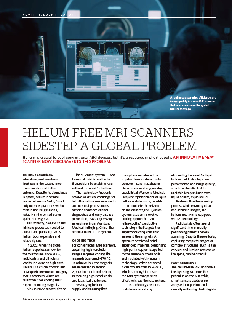 3年前,万东医疗牵头工信部“2021年国家新材料生产应用示范平台——医疗器械材料生产应用平台”重点工程,携手多家行业领军企业,从源头协同创新,打通无液氦磁共振产业链上下游,实现超导材料、无液氦磁体、整机系统全产业链自主研制和规模化生产,于2022年成功研创出全球首台无液氦超导磁共振。