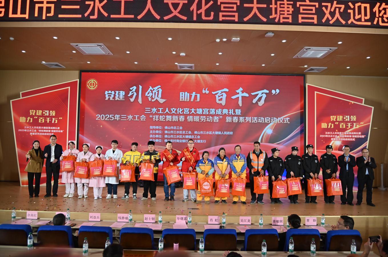 同日,三水区总工会的“情暖劳动者”新春系列活动启动仪式也在大塘宫热烈举行,向到场的劳模工匠、新业态劳动者、环卫工人、医护、公安等职工代表送上了新春礼包,表示对他们辛勤工作的感谢和新春的祝福。