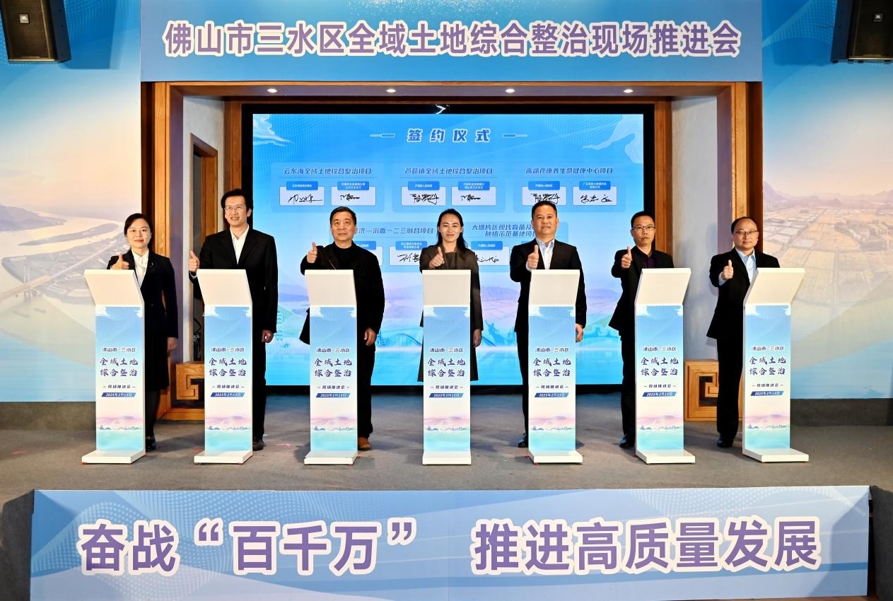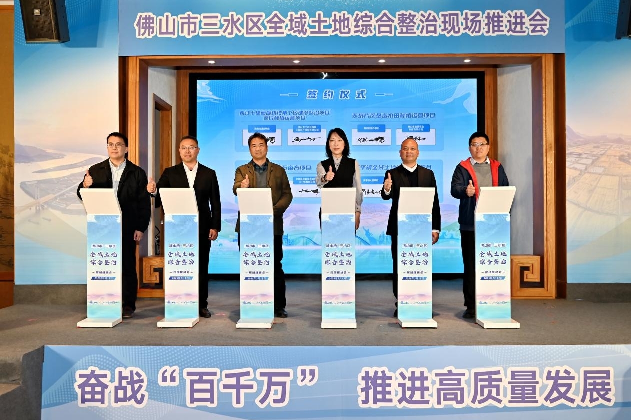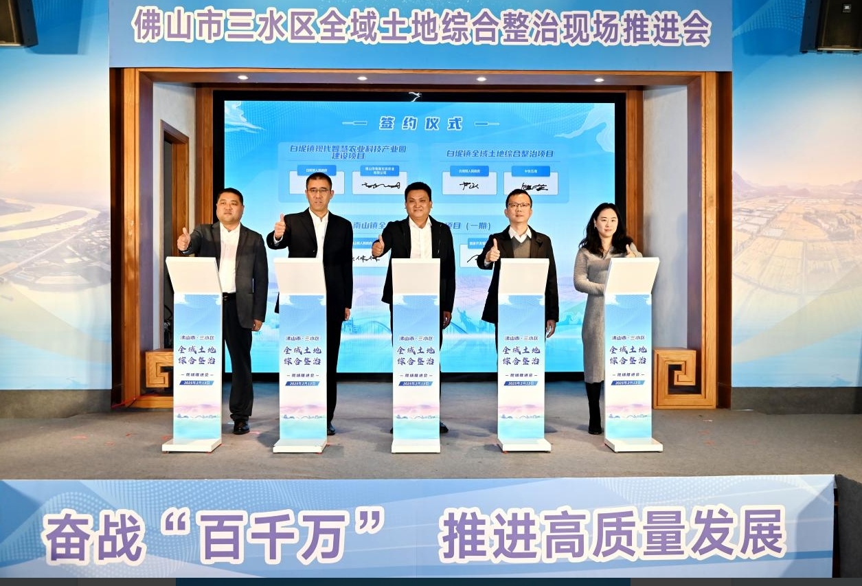 2月13日上午,三水区在南山镇举办全域土地综合整治现场推进会,组织与会代表参观漫江社区新农村示范社区、“千亩方”耕地集中整治区及智慧农业项目、旧街区风貌提升项目,大会邀请两家银行进行金融政策推介,由省市领导为各镇街全域土地综合整治项目进行授牌授旗,云东海全域土地综合整治项目、大塘片区现代育苗及标准化种植示范基地项目等七个镇街的12个投资项目进行现场签约,项目投资金额86.1亿元,银行授信金额63.9亿,标志着三水区2025年全域土地整治项目正式启动。