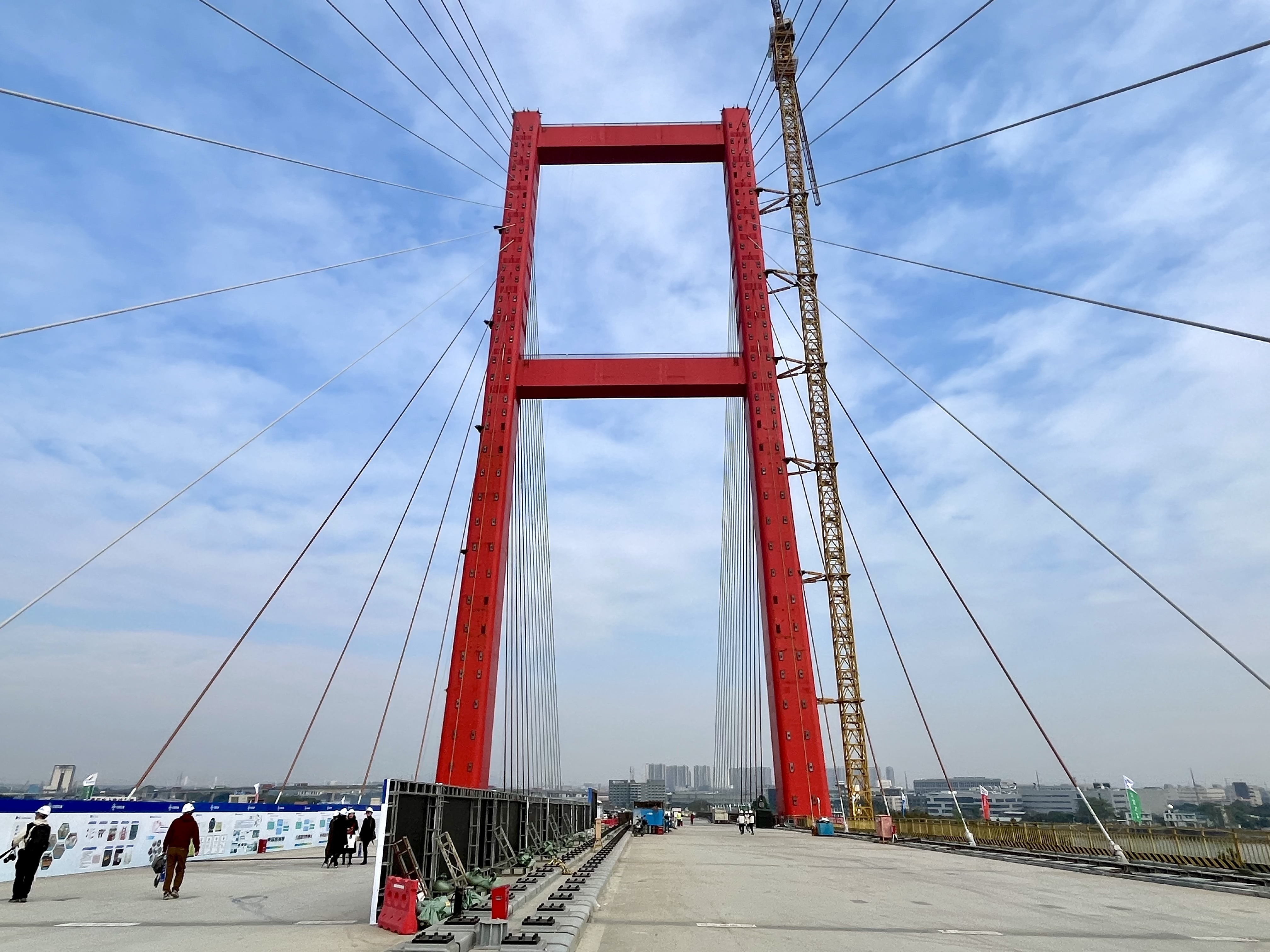 顺德大桥的建设本身即是技术突破的典范,两座高耸入云的红色索塔是顺德大桥最具辨识度的标志性建筑。为了克服索塔施工中吊装重量大、行程高、安装精度高等难点,顺德大桥项目施工方中交路桥建设有限公司自主研发出智能控制液压自爬升钢塔提升机,是全球首创的“大吨位多功能智能化钢塔提升机”,攻克了200吨级钢混结构高空精准安装难题。