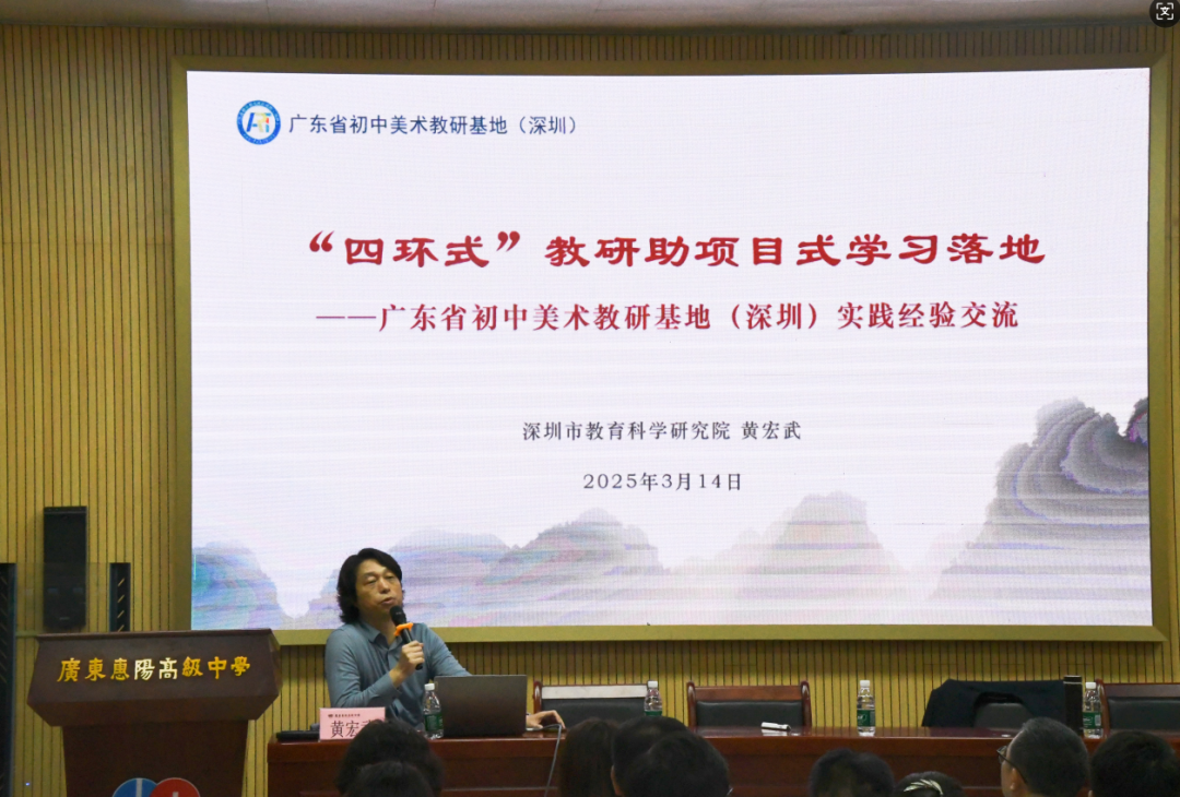3月14日下午,会议在惠阳高级中学正式拉开帷幕。此次会议得到了省教育研究院的高度重视,广东省教育教学研究院钟国荣老师、深圳市教育科学研究院德体艺教育研究中心主任黄宏武、广东外语外贸大学教授李于昆、佛山市教育局教研室美术教研员陈日新、广州市黄埔区玉树小学美术高级教师何楚如等相关专家亲临现场指导,广东省第五批省教研基地项目(小学美术、初中美术、高中美术)负责人及全体成员也悉数到场,共同开启这场美育盛会。