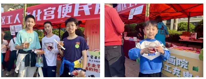 职工书画院为市民朋友派送清凉绿豆沙、美味花冻。佛山新闻网记者麦雪丹摄