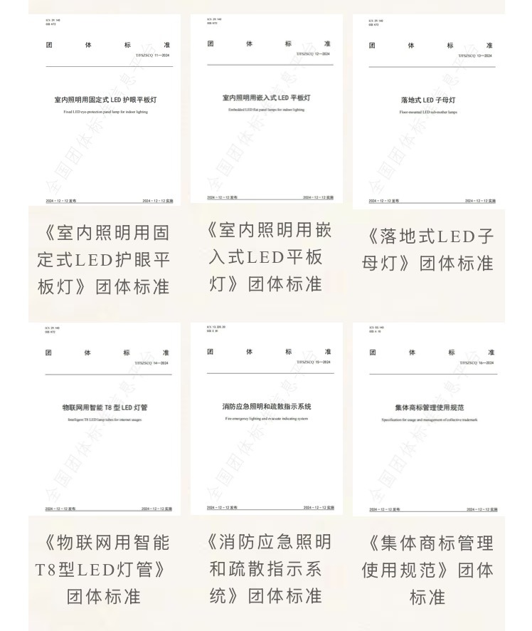 据了解,“均安照明”团体标准涵盖了6项内容,其中明确了《室内照明用固定式LED护眼平板灯》《室内照明用嵌入式LED平板灯》《落地式LED子母灯》《物联网用智能T8型LED灯管》《消防应急照明和疏散指示系统》等5个产品的具体标准,同时还制定了《集体商标管理使用规范》,不仅在产品的安全、节能、实用性上有相关规范要求,更注重用户服务、健康及技术创新。如《室内照明用固定式LED护眼平板灯》团体标准的制定,针对当前室内照明市场中护眼需求与LED技术深度融合的趋势,通过明确技术规范、健康指标和性能要求,为行业提供了统一的参考依据。