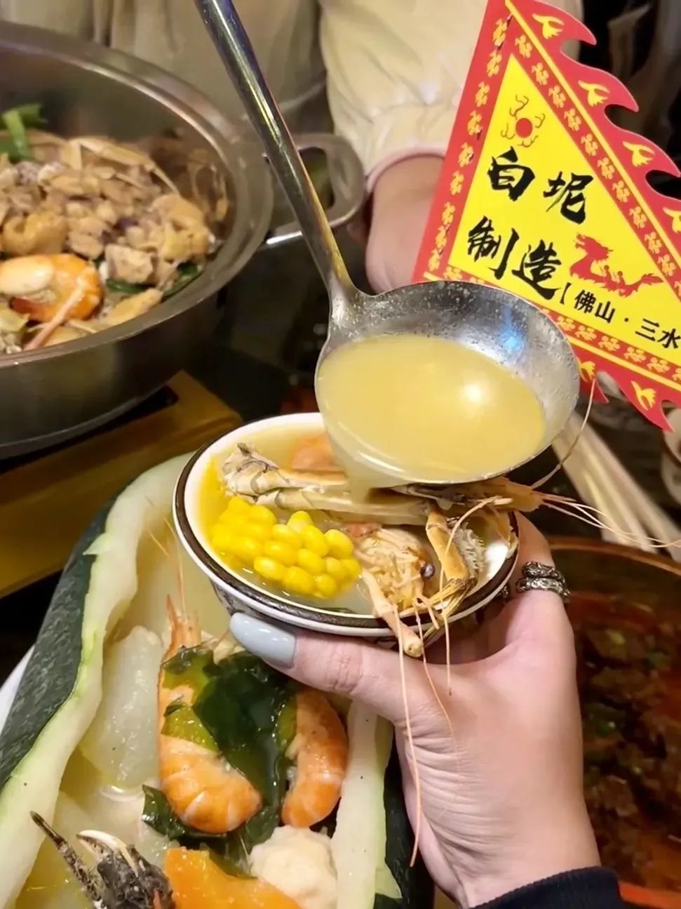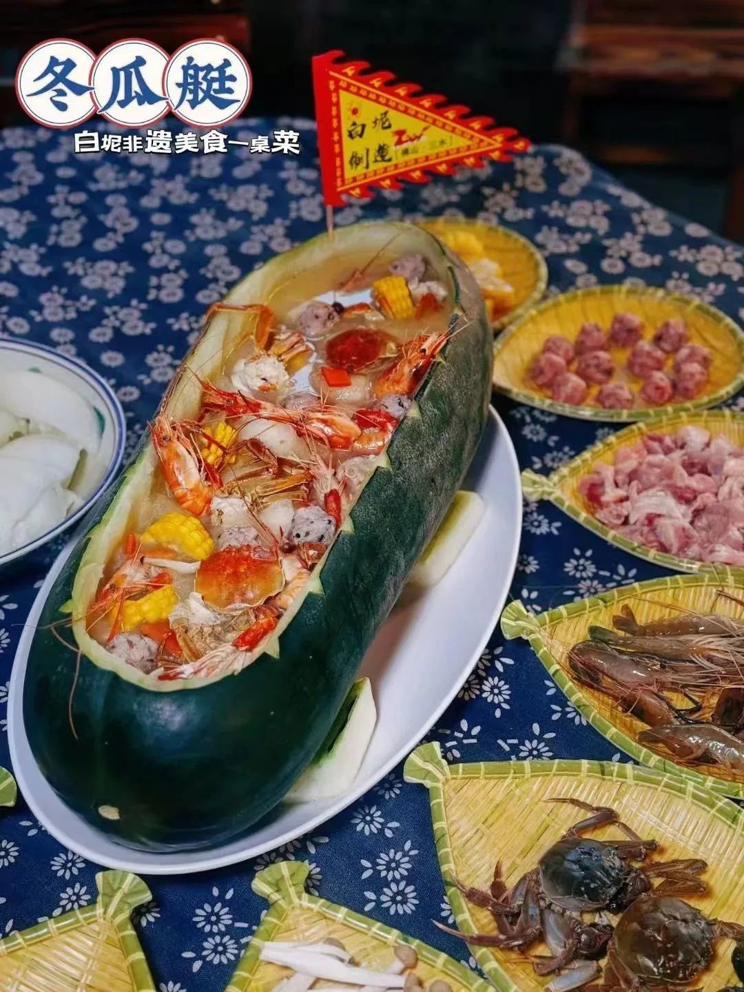 李庄主农庄的冬瓜艇选用国家地理标志三水黑皮冬瓜为原材料,打横放置造出“船”的效果,内里选用西江河鲜搭配走地鸡制作而成,鲜香清润、齿颊留香。