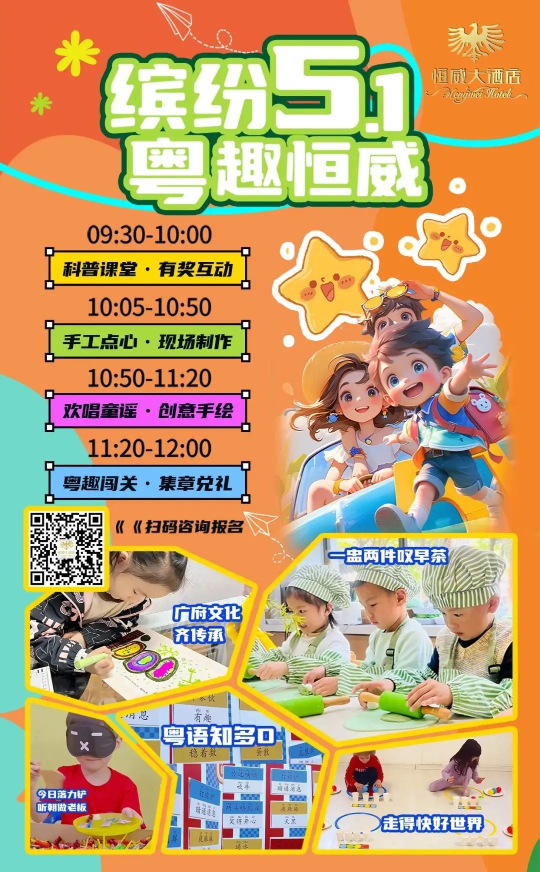 【活动内容】假期带着萌娃来恒威撒欢啦!科普小课堂打开广府早茶冷知识。亲手制作创意点心,变身小小点心师;唱跳童谣&创意绘画天马行空,粤式趣味闯关赢惊喜礼品~