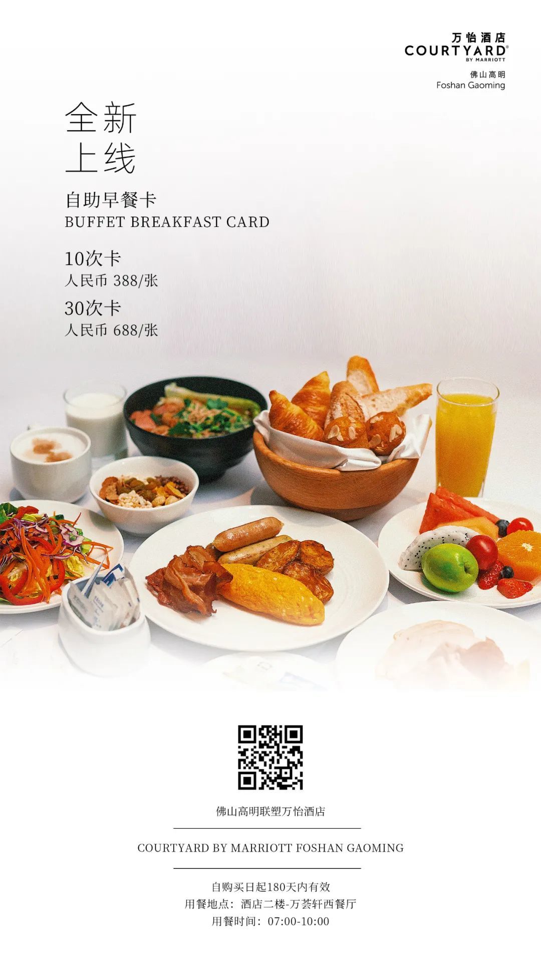 2.西餐厅早餐次卡:10次/388元,30次/688元,可拆分可赠送,180天使用有效期,用餐时间7:00-10:00,用餐地点二楼万荟轩;
