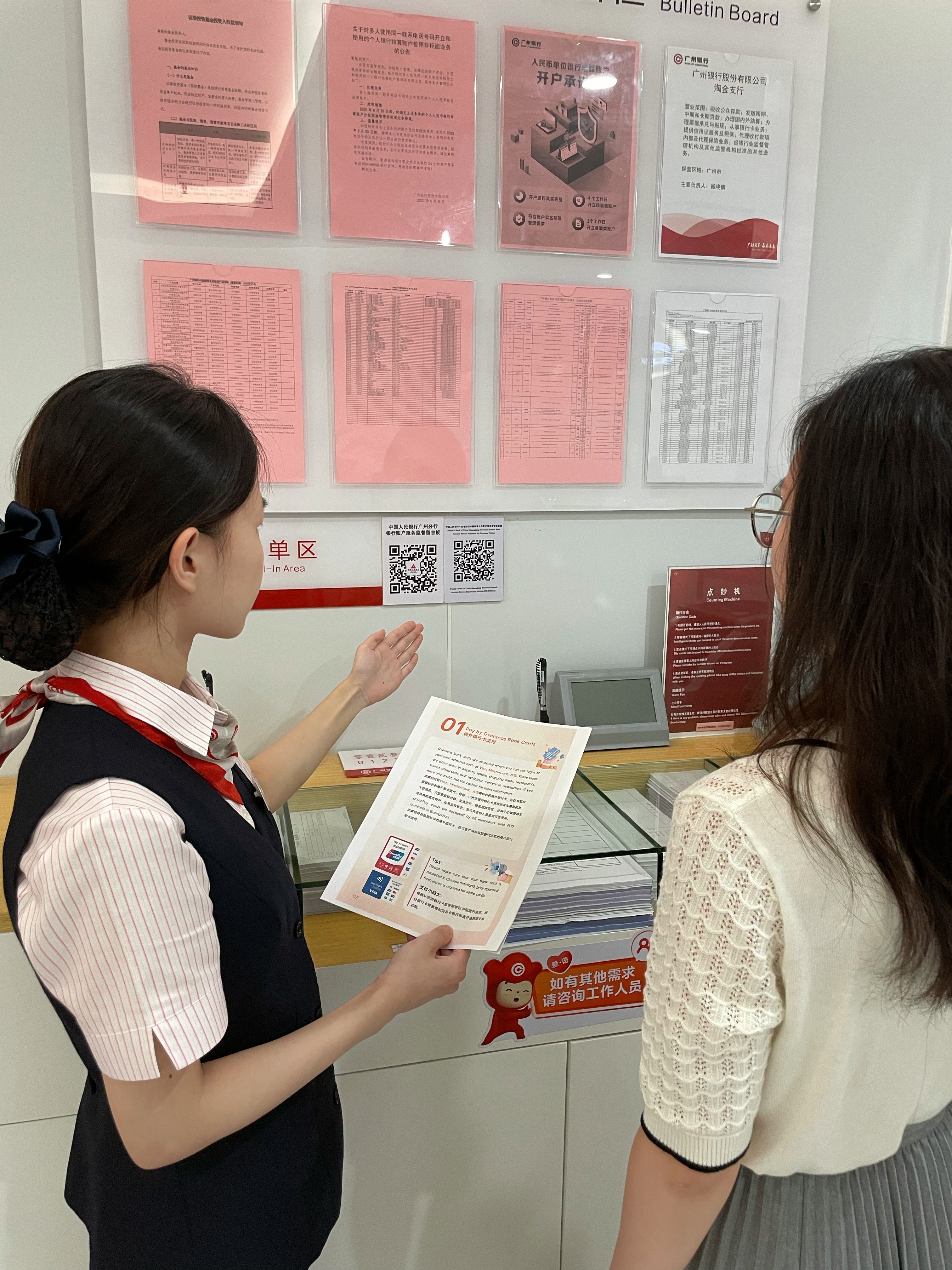 广州分行以网点为主战场,设立线下金融教育专区,打造“线上+线下”相结合的金融教育宣传矩阵。各营业网点在醒目位置摆放《个人外汇业务办理指南》《外籍来穗人员支付服务指南》等宣传材料,方便外籍人士随时取阅学习。各营业网点在广州分行的指导下积极开展线下“广州银行金融服务日”等特色金融教育宣传活动,针对外籍来粤人员常见的金融问题答疑解惑。为提供更加温馨的厅堂服务,充分发挥临柜业务客户服务面对面、一对一的优势,广州分行开展专项“网点厅堂服务优化行动”,更好地满足外籍来华人士及银发客群等特殊群体需求,做好适老化、国际化的金融服务。