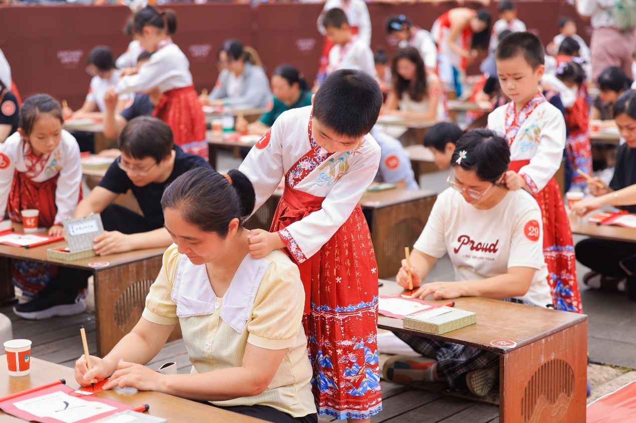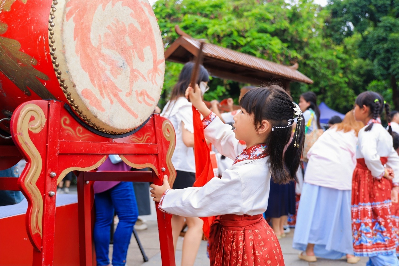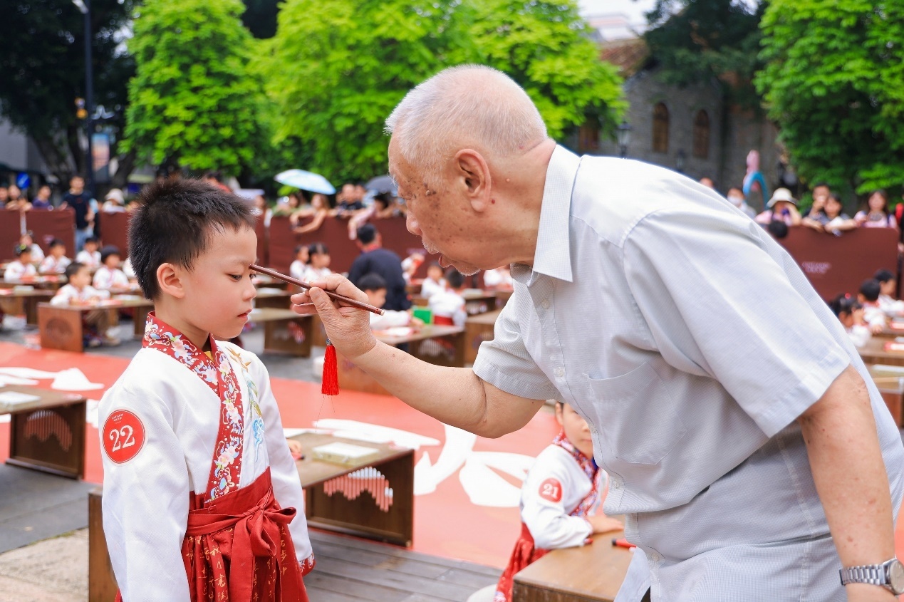 6月1日儿童节当天,百位适龄学童身穿汉服,相聚岭南天地鲤鱼广场,完整体验开笔礼仪式,岭南天地更特邀原佛山大学教授、学者余福智先生为学童点朱砂开智。眉间一点朱砂,唤醒学童对知识的敬畏,手执毛笔写下“人”字,领悟“为学先为人”的深刻道理。