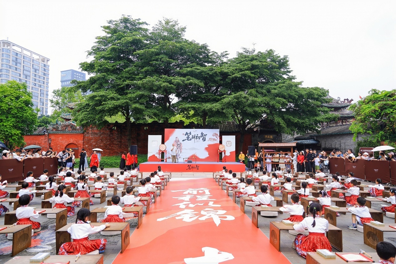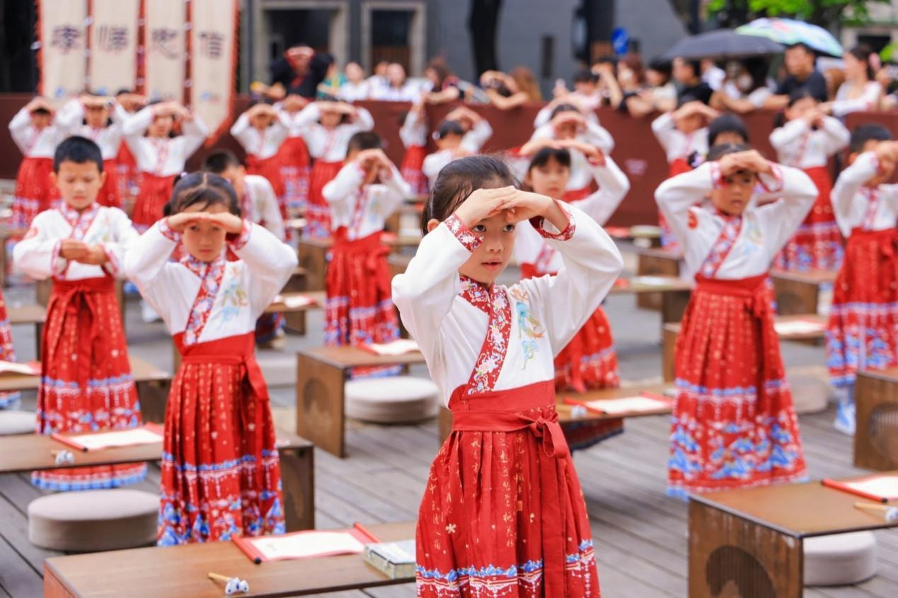 开笔礼作为中国古代重要的启蒙仪式,其雏形可追溯至春秋时期的“束脩之礼”。自明清以来,佛山因商贸兴盛、文风昌炽,开笔礼逐渐发展为学童入学前的庄重仪式。整套流程包含正衣冠、跨状元桥、拜谒先师、诵读经典、击鼓明志、启蒙描红、朱砂启智等环节,寓意“以礼启智,以德树人”,承载着家族对子弟修身治学的期许。如今,开笔礼在传承中被赋予新内涵。岭南天地通过招募学童集体参与,重现传统礼序,既延续敬拜先师、启智明志的核心精神,亦融入亲子体验等现代设计,将百人开笔礼打造为连接古今的文化纽带,让传统文化在当代生活中焕发新生。