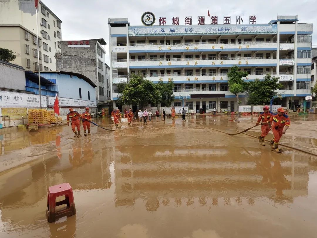 在怀城第五小学,消防救援人员利用高压水枪、铁铲等工具高效作业,连续作业7小时,协助校方于当日下午完成清淤任务,清理面积达3000平方米,为学校复课扫清障碍。