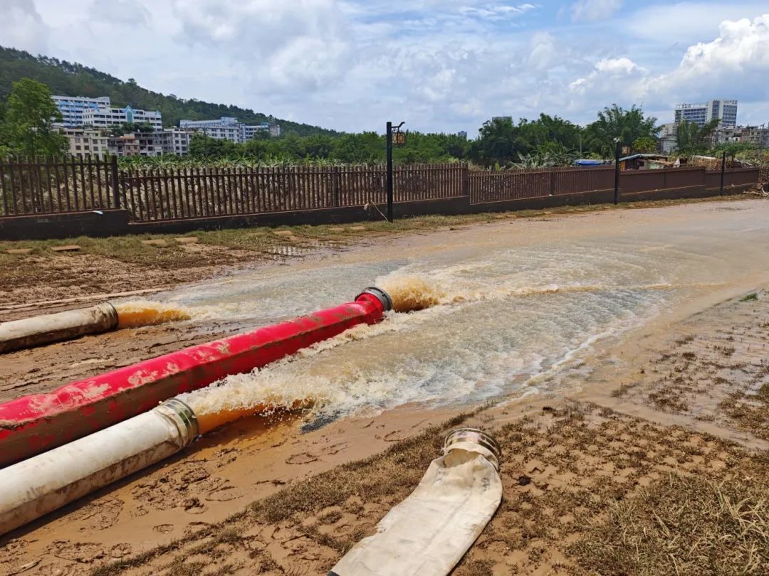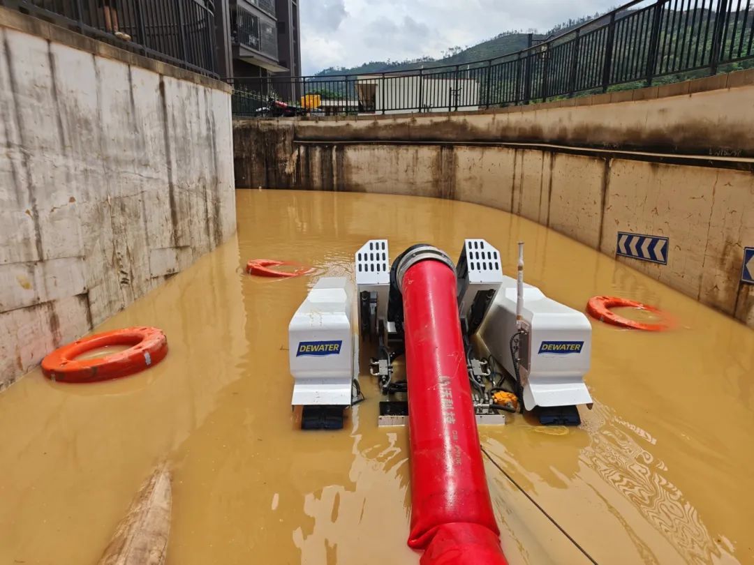 同日,支队排涝编队接令前往怀集县方圆滨江小区,处置严重积水的地下车库。队伍抵达后,立即启动大流量排涝设备,以每小时约3600立方米的流量全力排水,争分夺秒解除灾情。