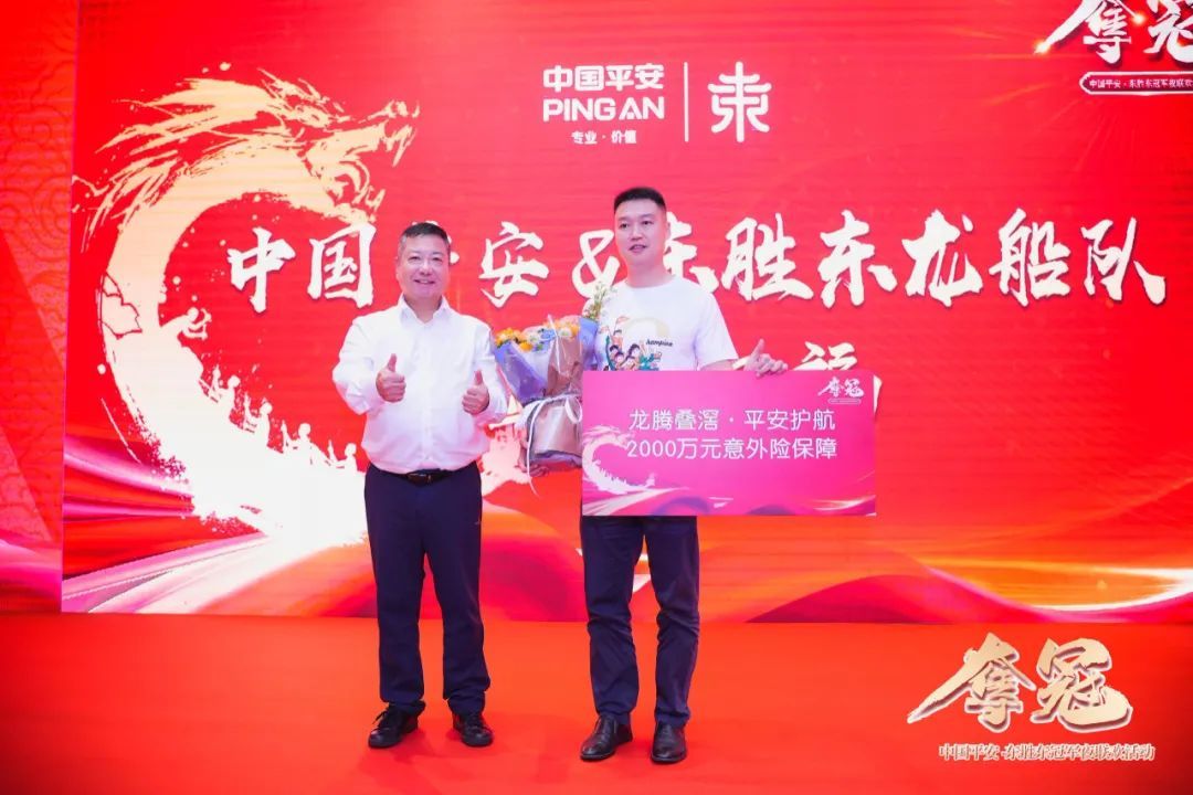 中国平安为赛事提供了2000万的专属保险保障,全力支持赛事顺利举办。东胜东龙船队向中国平安回赠了奖杯、金牌、锦旗以及夺冠战“桨”,寓意双方携手共创佳绩。此外,双方还互赠了精心准备的纪念礼物——“一壶平安”保温壶与龙船纪念礼盒,寄托了“人人有福气,平安两辈子”的美好祝愿,展现了彼此间的深厚情谊与合作精神。