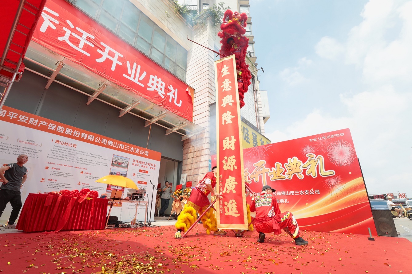 瑞狮纳福旺新居。采青环节将典礼气氛推至顶点。醒狮腾跃间摘下职场门前的“平安结”生菜,平安产险佛山分公司王然,三水支公司张远总分别接青纳福,象征业绩蒸蒸日上。祥狮口吐“财源滚滚 万事胜意”鎏金对联,赢得满堂喝彩。最后,醒狮巡游新职场每个角落,所到之处锣鼓喧天,为全体人员带来吉祥祝福。