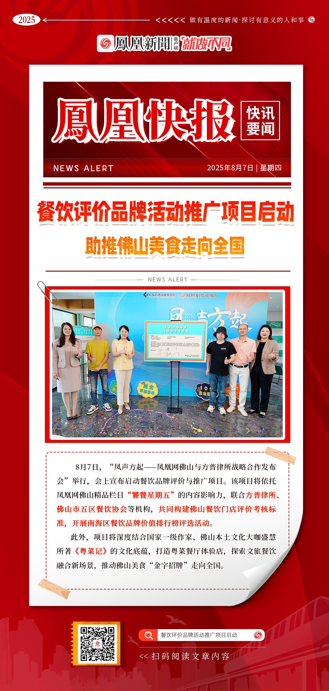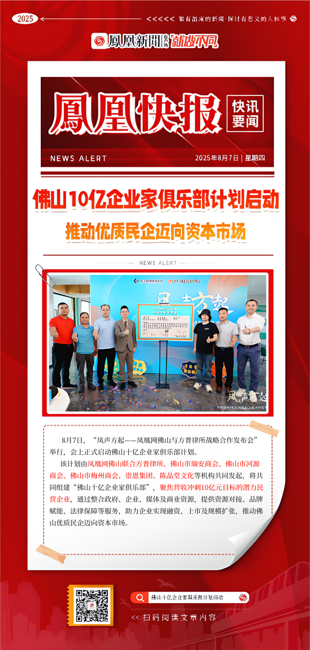 8月7日上午,“凤声方起——凤凰网佛山与方普律所战略合作发布会”正式举行,联合多方共同启动佛山10亿企业家俱乐部计划、餐饮评价品牌活动推广、历史建筑商业活化计划、“凰普局”普法栏目等四大项目。