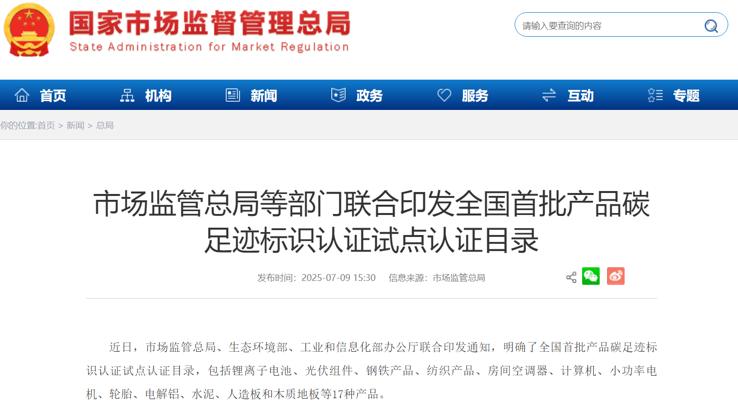 党的二十届三中全会《决定》强调“构建碳排放统计核算体系、产品碳标识认证制度、产品碳足迹管理体系”。市场监管总局等四部门联合印发的《关于公布产品碳足迹标识认证试点名单的通知》《产品碳足迹标识认证试点认证目录(第一批)》明确遴选广东省佛山市开展空调产品碳足迹标识认证试点工作,并将房间空调器等17种产品纳入全国首批认证试点目录范围。
