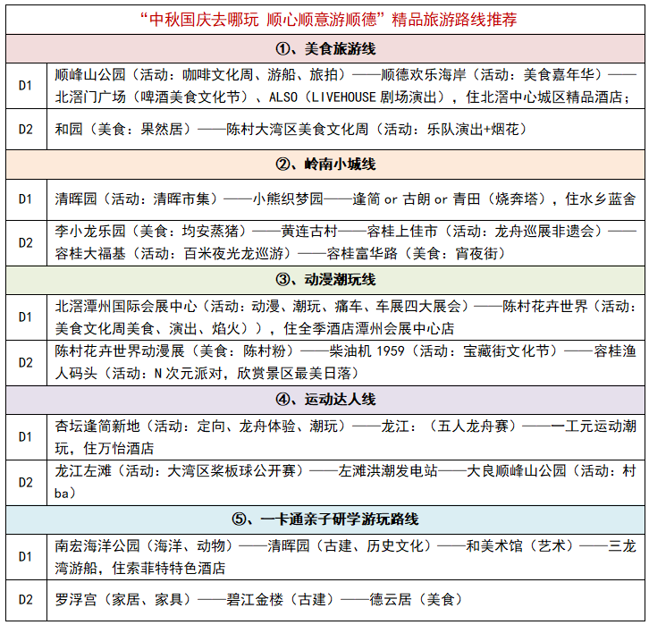 为方便游客深度畅游顺德,顺德区文广旅体局精心策划了“美食旅游线”“岭南小城线”“动漫潮玩线”“运动达人线”“一卡通亲子研学游玩路线”5条精品旅游路线,为游客提供丰富多彩的游玩组合。