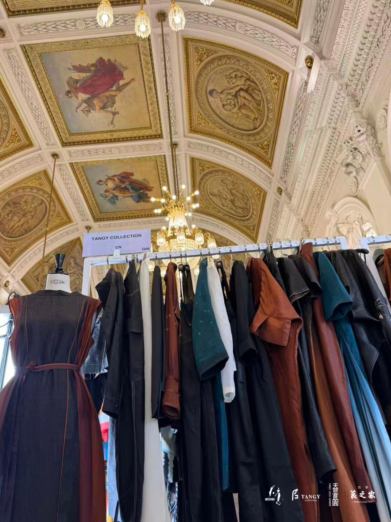其中,香云纱服饰品牌——TANGY Collection以其深厚的东方美学底蕴与当代设计表达,成功入选巴黎布隆尼亚宫(Palais Brongniart)内最高规格的拿破仑(Salon de Napoléon)展厅——一个历来仅对极具影响力的国际顶级品牌开放的展示空间。高耸的穹顶、百年历史的金融圣殿与顺德香云纱所蕴含的东方美学相得益彰,共同营造出一个跨越时空的美学场域,也标志着中国设计在国际舞台上的又一次高度认可。