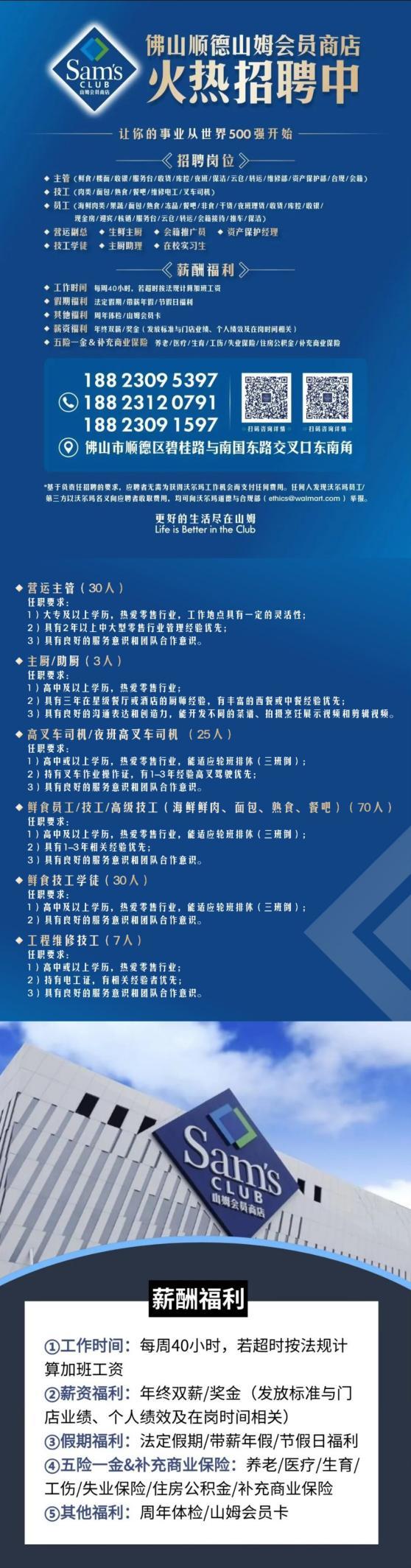 当前,顺德山姆会员店正进入招牌阶段。据了解,顺德山姆会员店释放多个岗位,涵盖主管、经理、技工、学徒、实习生等多个层级,提供世界500强企业工作机会及广阔的职业发展路径,有竞争力的薪酬福利待遇和超越自我的成长平台。招聘时间为每周一至周五9:00-16:30。