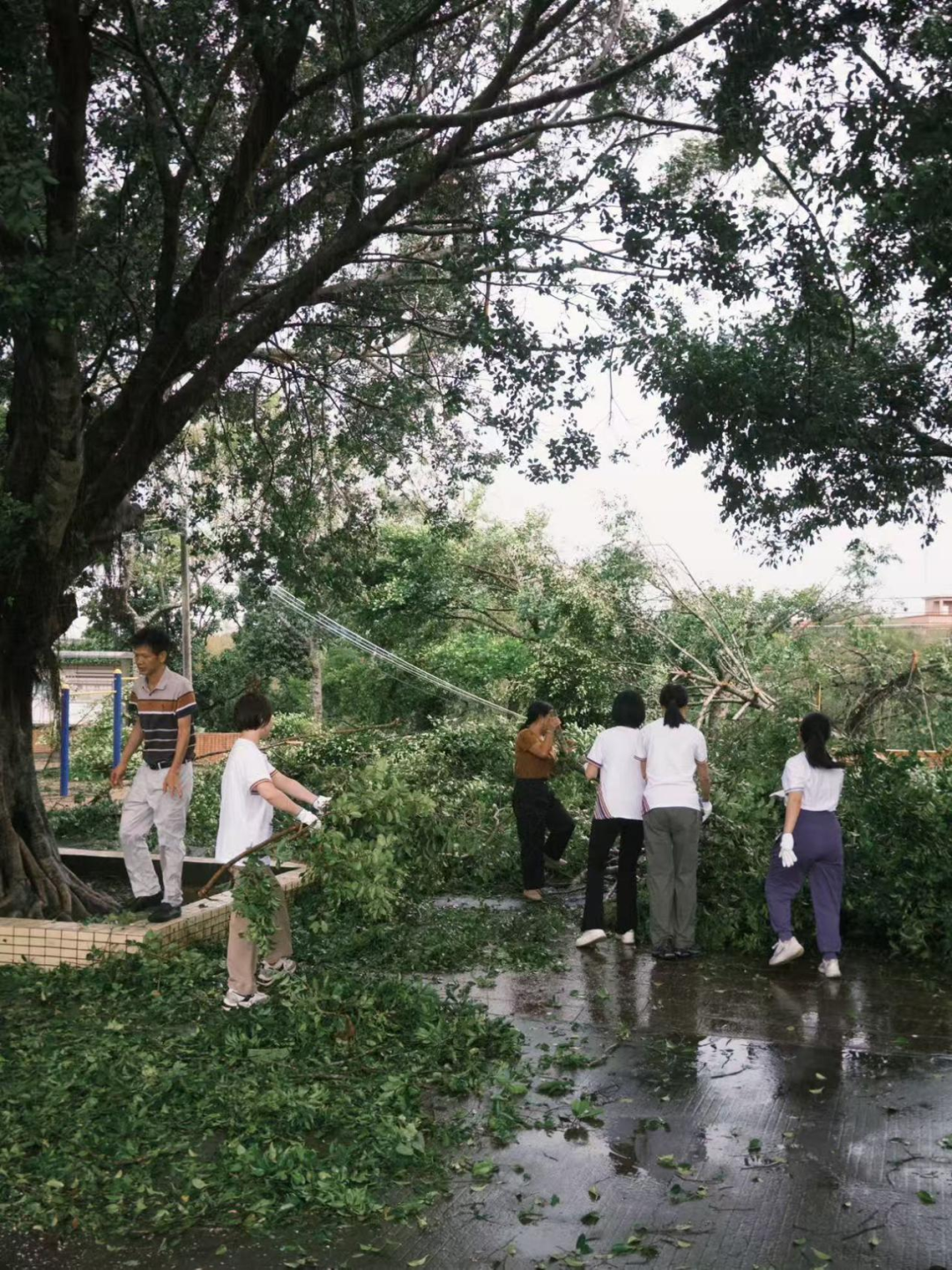 台风过境,校园里倒伏的树木、散落的枝叶、翻倒的乒乓球台和被吹烂的告示牌,无一不诉说着风暴的猛烈。在停水停电的情况下,我们立刻投入到校园修复工作中,与学校领导、老师们一同清理校园。下午,我们又拿起粉笔,生平第一次尝试绘制中秋国庆主题的黑板报。从讲台上的老师,到灾后的清洁工,再到黑板报的“设计师”,角色的转换让我们对“支教”二字有了更深刻的理解——它不仅是知识的传递,更是风雨同舟的担当。