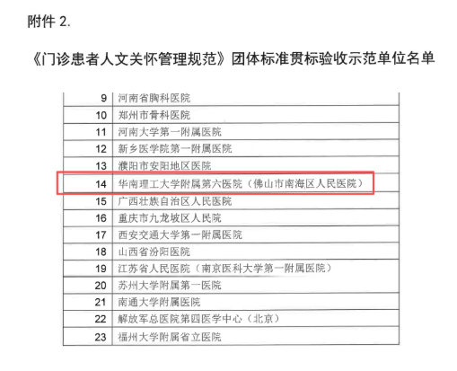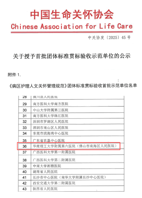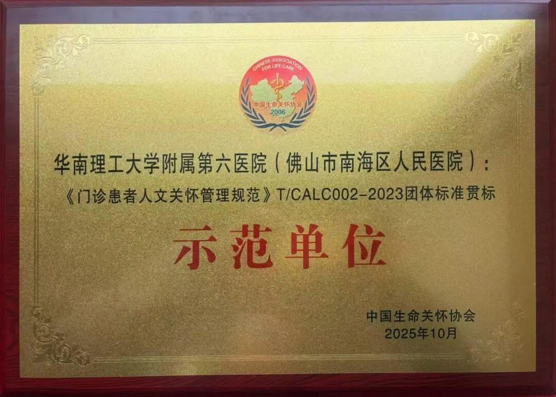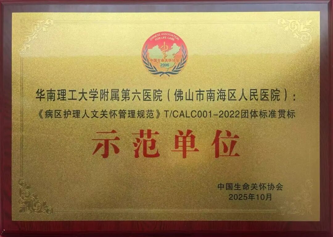 2025年10月16日,经过中国生命关怀协会专家组严格评审,华工附六院(南海医院)凭借在护理人文关怀标准化建设中的突出成效,双双荣获《病区护理人文关怀管理规范》《门诊患者人文关怀管理规范》首批团体标准贯标示范单位,成为全国同时通过两项规范验收的标杆医院(广东省唯一)。