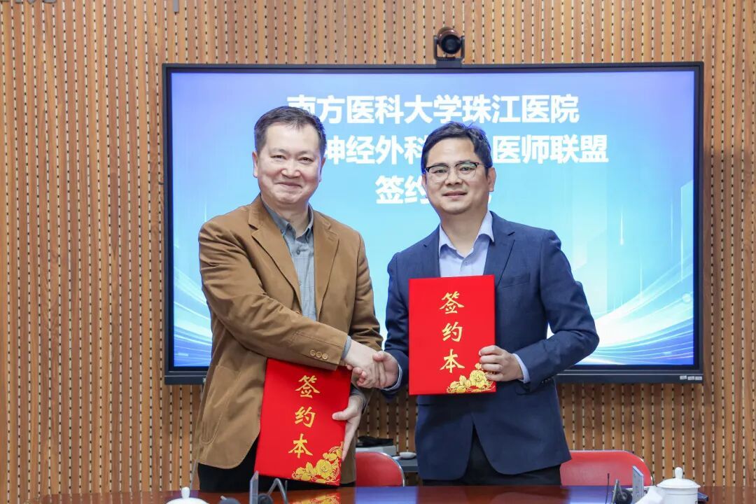 此外,活动还特别邀请了南方医科大学珠江医院神经外科中心主任张旺明教授带来脑机接口领域的前沿技术分享,并举行“神经外科专科医师联盟”签约仪式。通过此次签约,双方将围绕脑机接口与神经调控等领域,在人才培养、技术交流、科研合作等方面开展深度合作。