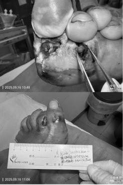 许雪娟主任对患者进行全面评估:左足多处溃烂,其中左第一、第二足趾创面深至肌腱暴露,按糖尿病足Wagner分级已达3级。面对如此复杂的病情,团队迎难而上,为于先生制定了创新的治疗方案。