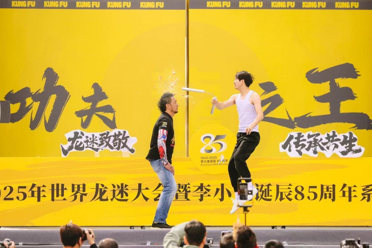 活动现场上演一系列精彩纷呈的功夫表演,将气氛推向高潮。双截棍吉尼斯纪录创造者谢德胜带来了惟妙惟肖的李小龙模仿秀及高难度双截棍表演;功夫武(舞)齐喊“功夫之王”,震撼人心;叶问咏春拳非遗传承人董崇华则展示了精湛的传统咏春功夫,引来阵阵掌声。