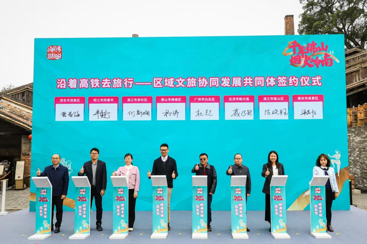 本届欢乐节的核心亮点之一,是依托广湛高铁开通带来的“1.5小时生活圈”优势,深化区域文旅协同发展。开幕式上,禅城区牵头举办“沿着高铁去旅行——区域文旅协同发展共同体”签约仪式,与广州市白云区、肇庆市高要区、湛江市赤坎区、霞山区、茂名市茂南区、阳江市阳春市、云浮市新兴县共同签署合作协议,正式构建起资源共享、客源互送、线路互通的区域文旅合作新机制。