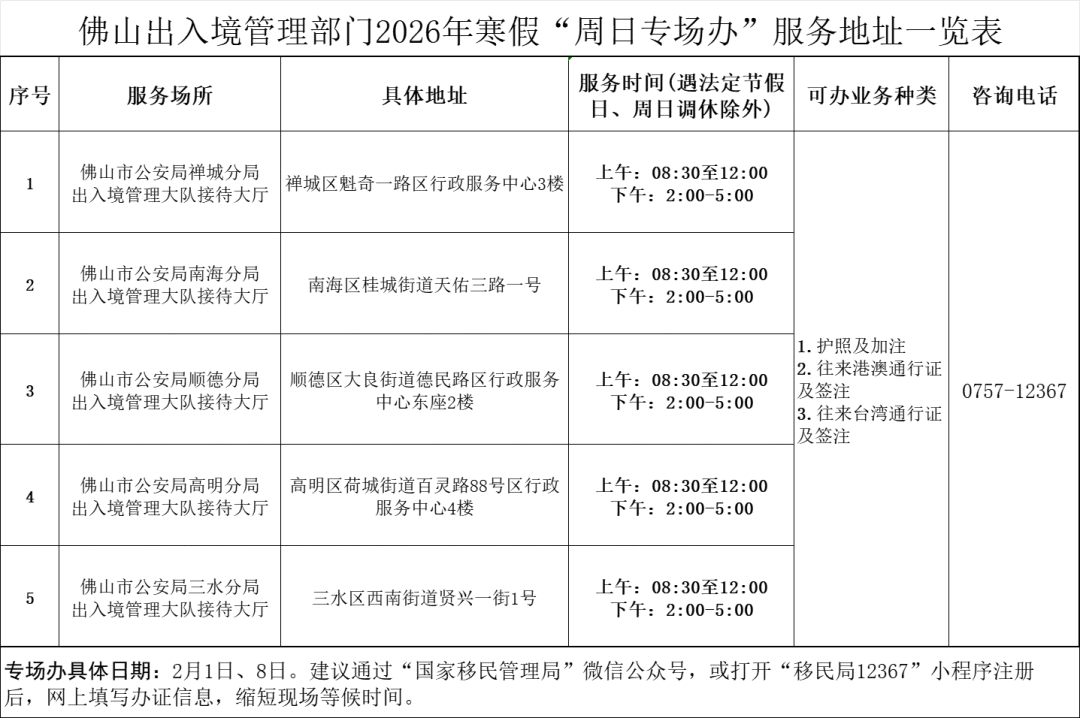 寒假期间,佛山公安出入境管理部门将推出“周日专场办”办证便民措施,服务时间为2月1日、2月8日,8:30-12:00、14:00-17:00,地点为佛山公安出入境管理部门五区接待大厅,主要面向在佛山就读的在校学生及家长,办理护照、往来港澳台通行证及签注业务。
