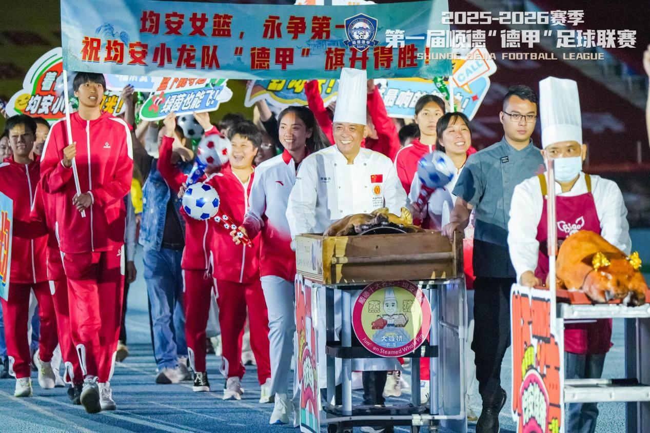作为“世界美食之都”,顺德人骨子里对美食的执着,更流淌进了这片绿茵场的每一个角落。开幕式的入场式,直接变成了一场“舌尖上的顺德”巡游。伦教艾凯队中的演员们挑着礼饼、推着伦教糕,将甜蜜的香气洒满跑道;勒流东泰队中的厨师推着油光锃亮的烧鹅昂首入场,引得观众席上一片欢呼;均安小龙队更是直接把整只热气腾腾的蒸猪抬上了球场,瞬间点燃全场热情……
