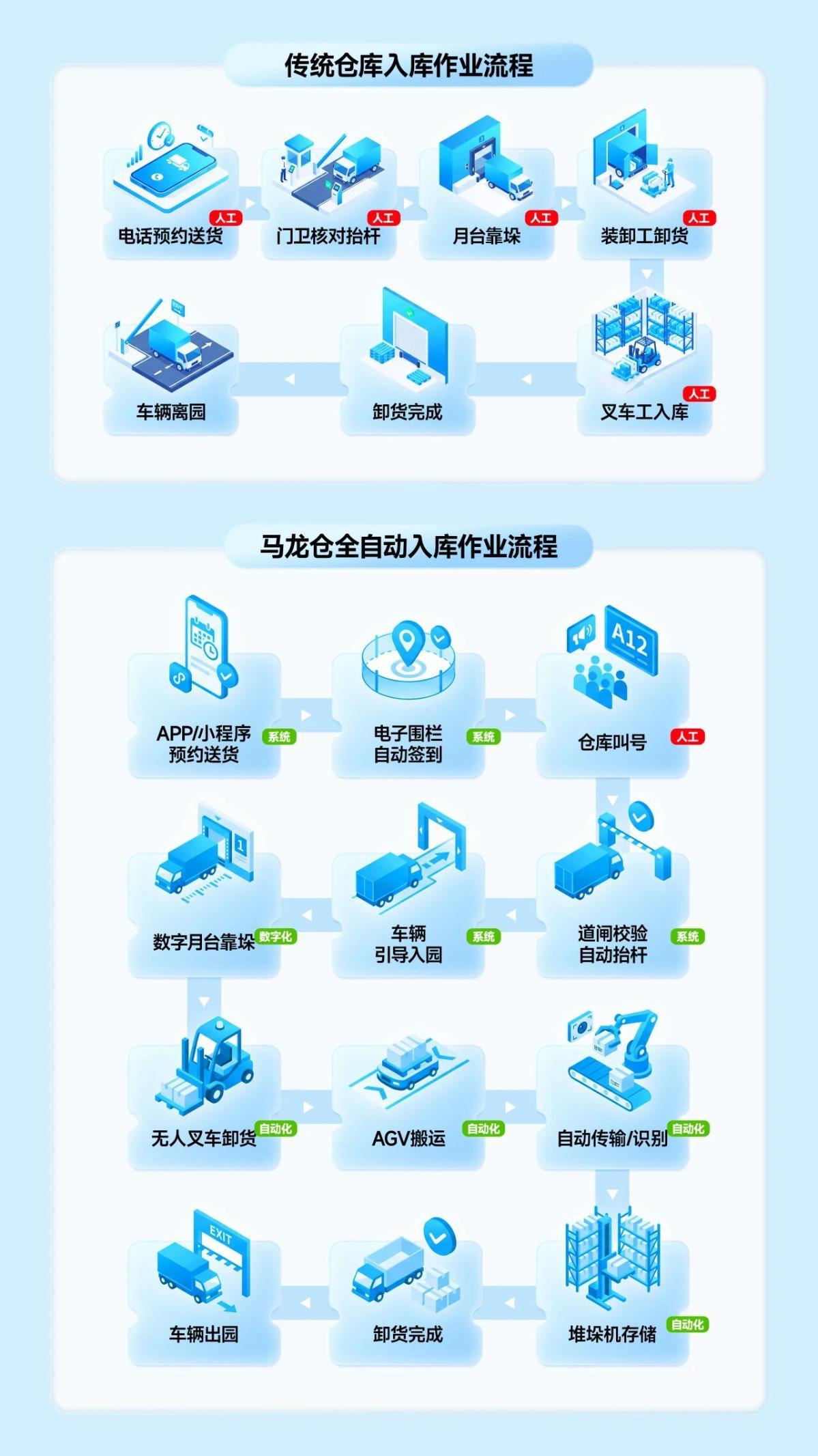 区别于传统仓储入库依赖人工、线下的作业方式,马龙仓在本次带板装卸自动化升级后,实现从预约-排队-签到,带板装卸到输送入库的全流程自动化、智能化,完成从传统仓到自动化标杆仓的跨越。